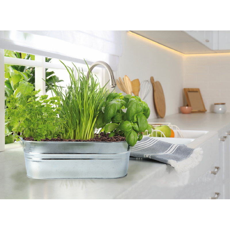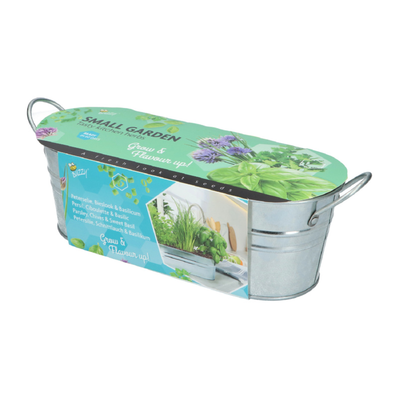 Een mooie zinken teil met materiaal om zelf kruiden te kweken. Hiermee heb je direct alles om mee te starten om daarna zelf je verse kruiden uit eigen tuin te plukken.